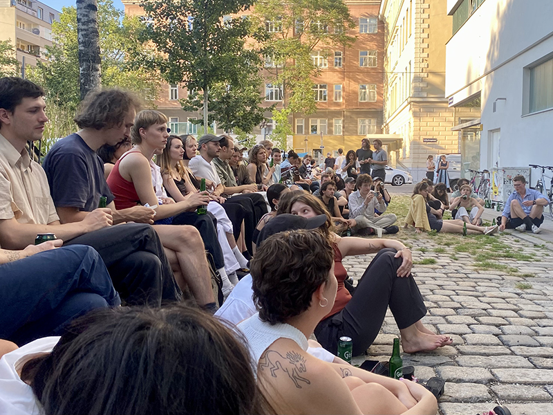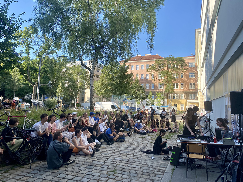 “Bum Bum Tschak”, site-specific art, Vienna, 2023. Constituting a musical structure via the experiment – the rehearsal. Coming to solutions via coincidence or to a conception via improvisation. To let the ego, the collective authorship take precedence. The urge to do is stronger than the search for perfection. Questioning the right and giving the wrong a chance. Confronting the public with it and occupying this space acoustically.
