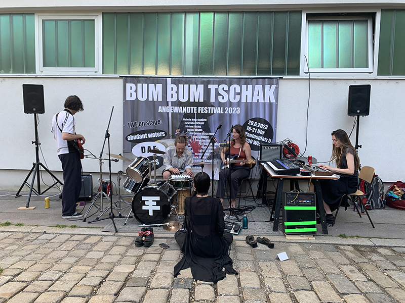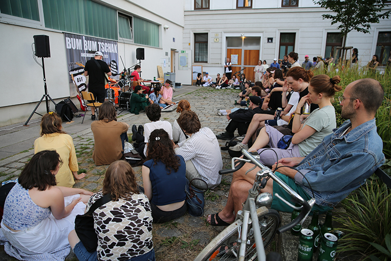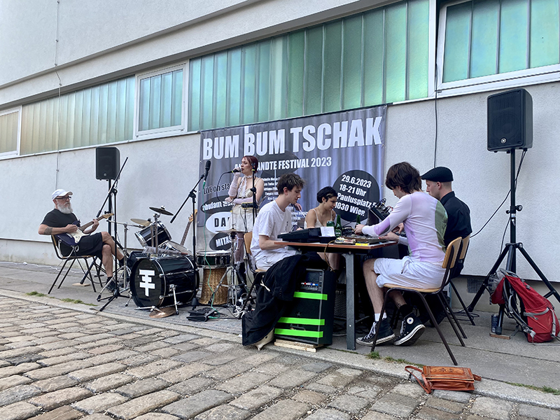 „Bum Bum Tschak“, Ortsbezogene Kunst, Wien, 2023. Das Konstituieren eines musikalischen Gefüges über das Experiment – die Probe. Über den Zufall zu Lösungen oder über die Improvisation zu einer Konzeption kommen. Dem Ego, der kollektiven Autor:innenschaft den Vortritt lassen. Der Drang des Tuns ist stärker als die Suche nach Perfektion. Das Richtige hinterfragen und dem Falschen eine Chance geben. Die Öffentlichkeit damit konfrontieren und diesen Raum akustisch besetzen.