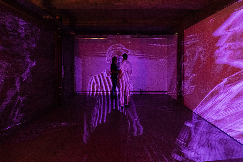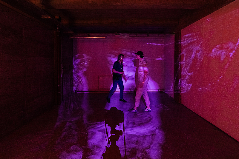 Die Installation Präsenz zielt darauf ab, die Betrachter:innen in einen extremen Zustand zu versetzen. Die Präsenz einer Person im Raum aktiviert die visuelle und auditive Installation und verändert so die Atmosphäre. Die Konditionierung und die Überforderung mit neuen Impulsen sind die Elemente, in die die Betrachter:innen eintauchen. Am Anfang herrscht Kontrollverlust und scheinbares Chaos, bis der:die Besucher:in mit dem eigenen Körper und der Umgebung zu spielen beginnt. Die multisensorische Auseinandersetzung mit sich selbst und die visuelle Dissoziation, bei der man sich überdimensional selbst spiegelt, tragen zur immersiven Erfahrung bei. Basierend auf Theorien des “Theaters der Grausamkeit” von Antonin Artaud, schafft diese Installation durch die Verwendung von gewalttätigen und schockierenden Bildern und Klängen, die die Sensibilität der Zuschauer:innen angreifen, eine sensorische Erfahrung.
